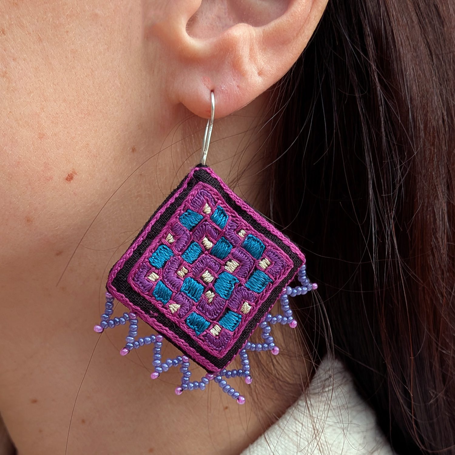 Boucles d’oreilles Meena délicatement brodées à la main en Inde.