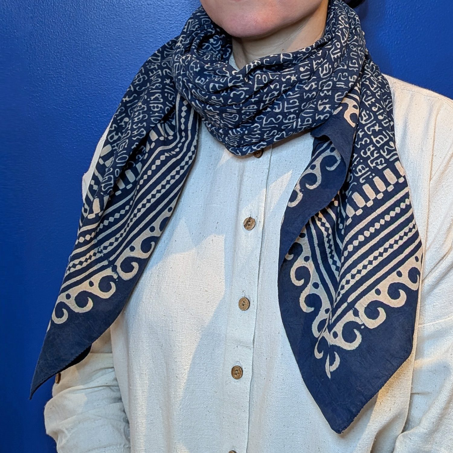Le Grand carré « MANTRA » indigo est imprimé au tampon en bois avec des pigments naturels.